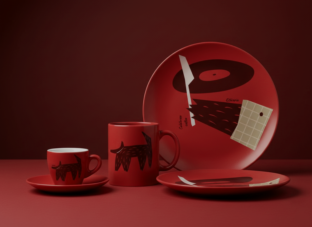 심볼로 등장하는 검은 개와 레코드 그래픽은 브랜드의 위트와 창의성을 대표합니다. 단순한 일러스트처럼 보이지만, 커피 원두와 레코드판을 연상시키며 브랜드의 즐거움과 개성을 동시에 담아냅니다. 세련된 산세리프 로고는 깔끔하게 브랜드를 정리해주며, 포스터·패키지·머천다이즈 어디서든 강한 존재감을 발휘합니다.