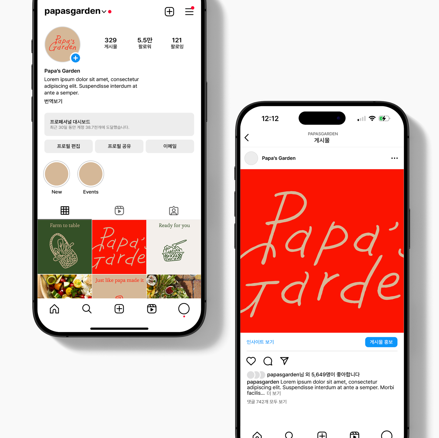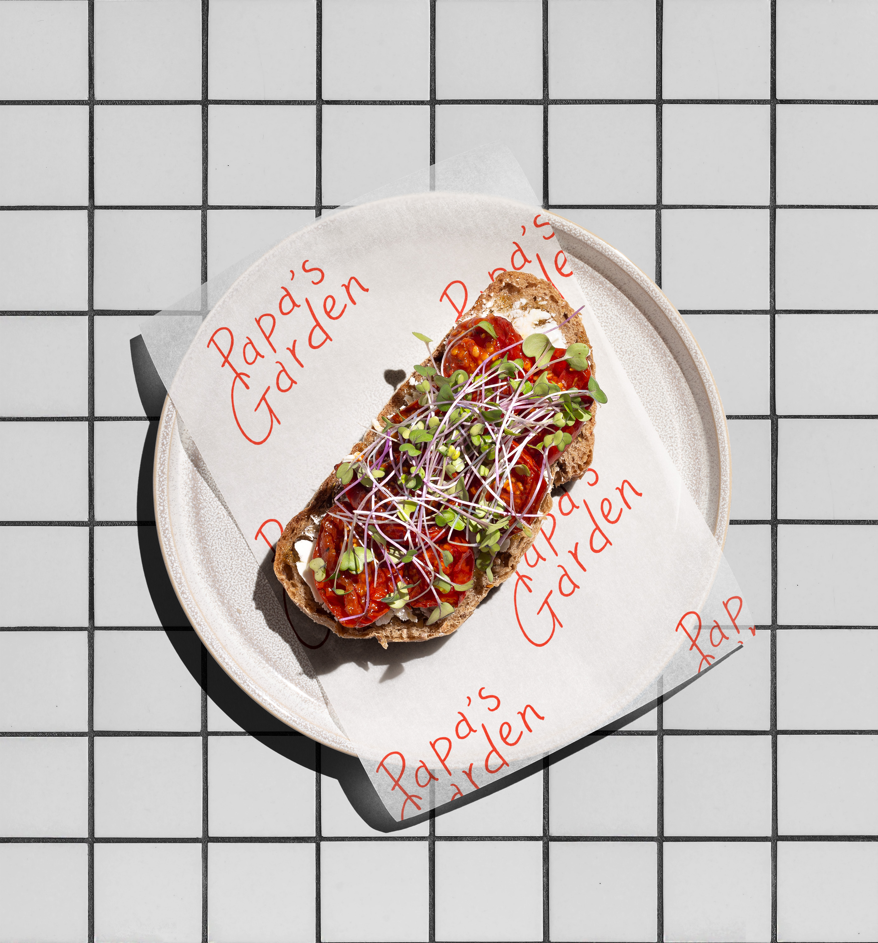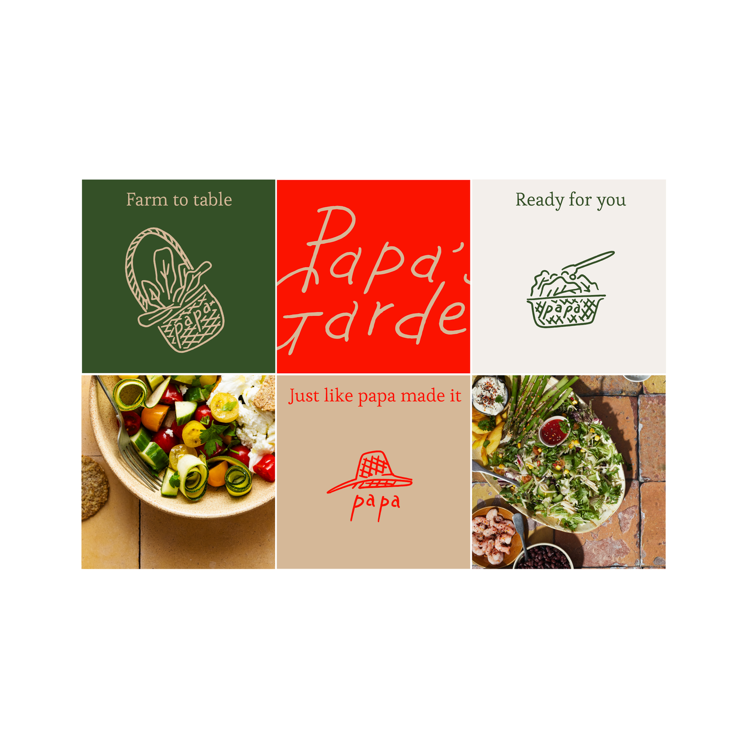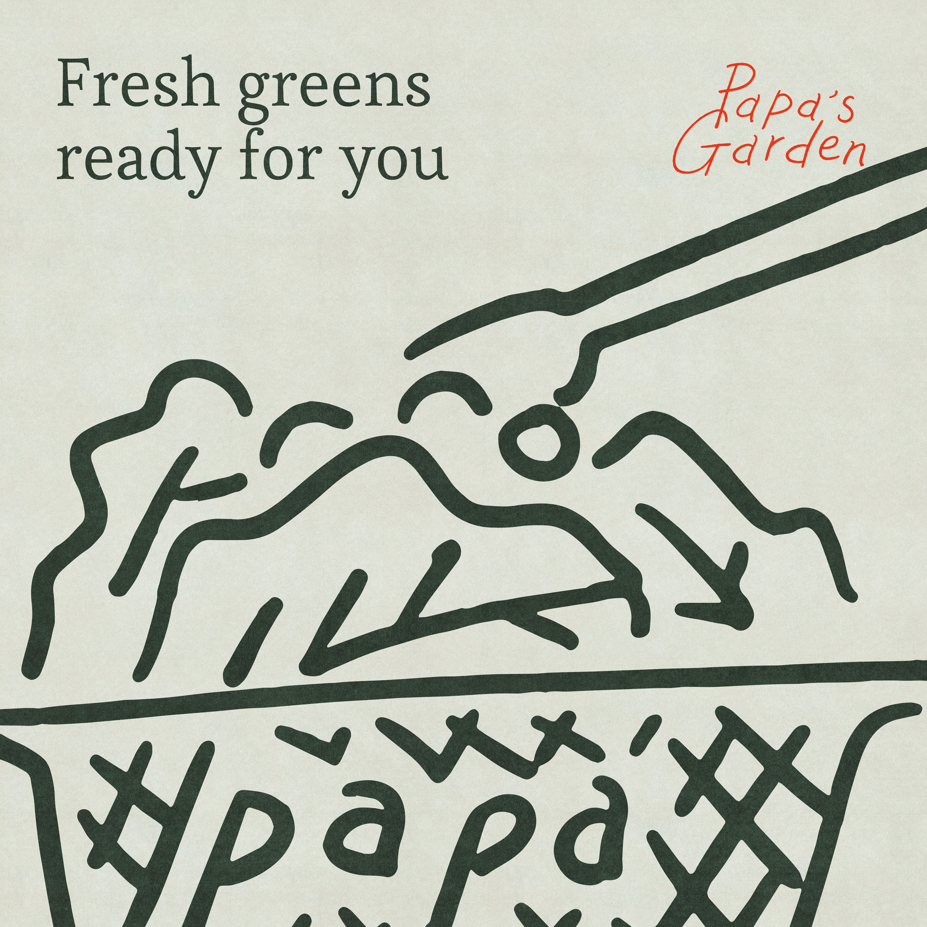 브랜딩의 핵심은 직접 손으로 쓴 로고와 내추럴 크라프트지 질감, 레드 포인트 컬러입니다. 손글씨 로고는 따뜻한 정성과 진심을 그대로 담아내며, 이는 매장과 테이크아웃 패키지, 그래픽 시스템 전반에서 Papa’s Garden의 정체성을 일관되게 전달합니다.