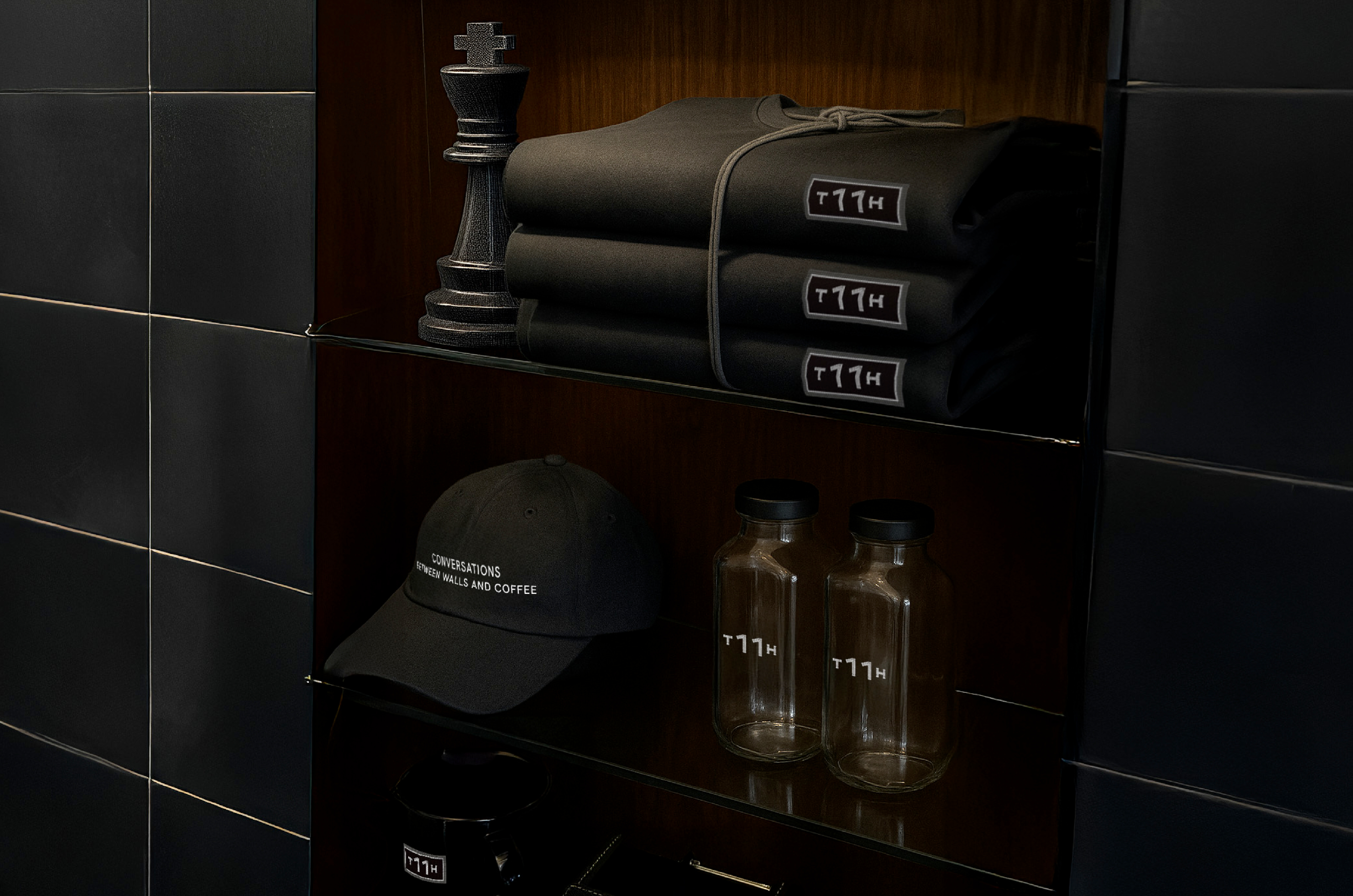 T11H의 시그니처 타일 그래픽은 인테리어와 굿즈까지 확장되어 브랜드의 일관성을 강화합니다. 매장에서 만나는 공간은 마치 정교하게 설계된 타일 작품 속에 들어온 듯한 몰입감을 선사하며, 머그, 텀블러, 의류 등 다양한 굿즈에 적용된 타일 텍스쳐는 카페 경험을 일상으로 이어갑니다. 프리미엄 카페로서의 고급스러움과 독창적 비주얼 아이덴티티가 조화를 이루며, T11H는 단순한 카페를 넘어 디자인과 라이프스타일을 함께 제안하는 브랜드로 자리 잡습니다.